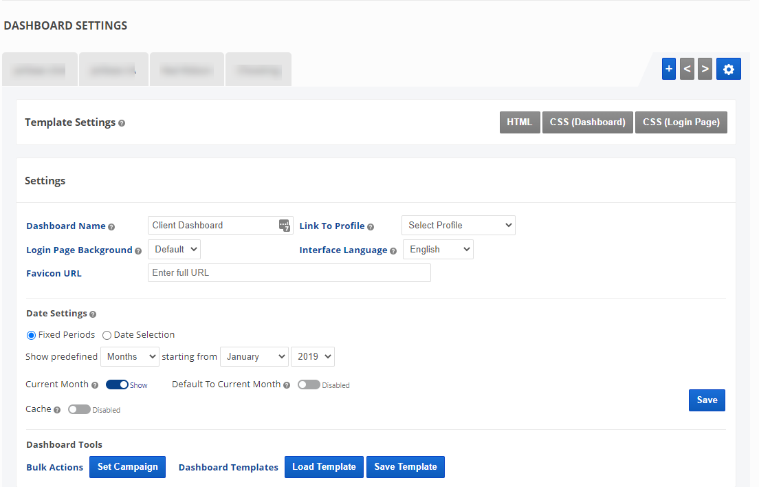 Important: When the template has loaded you need to click the Bulk Actions Set Campaign button and select the campaign that should be applied globally to reports and graphs that are in the dashboard template. Marketing Dashboards can contain reports for multiple campaigns in one dashboard, for example, if a client has separate campaigns for website tracking, app store tracking and YouTube tracking, you can create pages for each campaign inside of one dashboard. After selecting the global campaign, you may change the campaign of specific reports as needed.