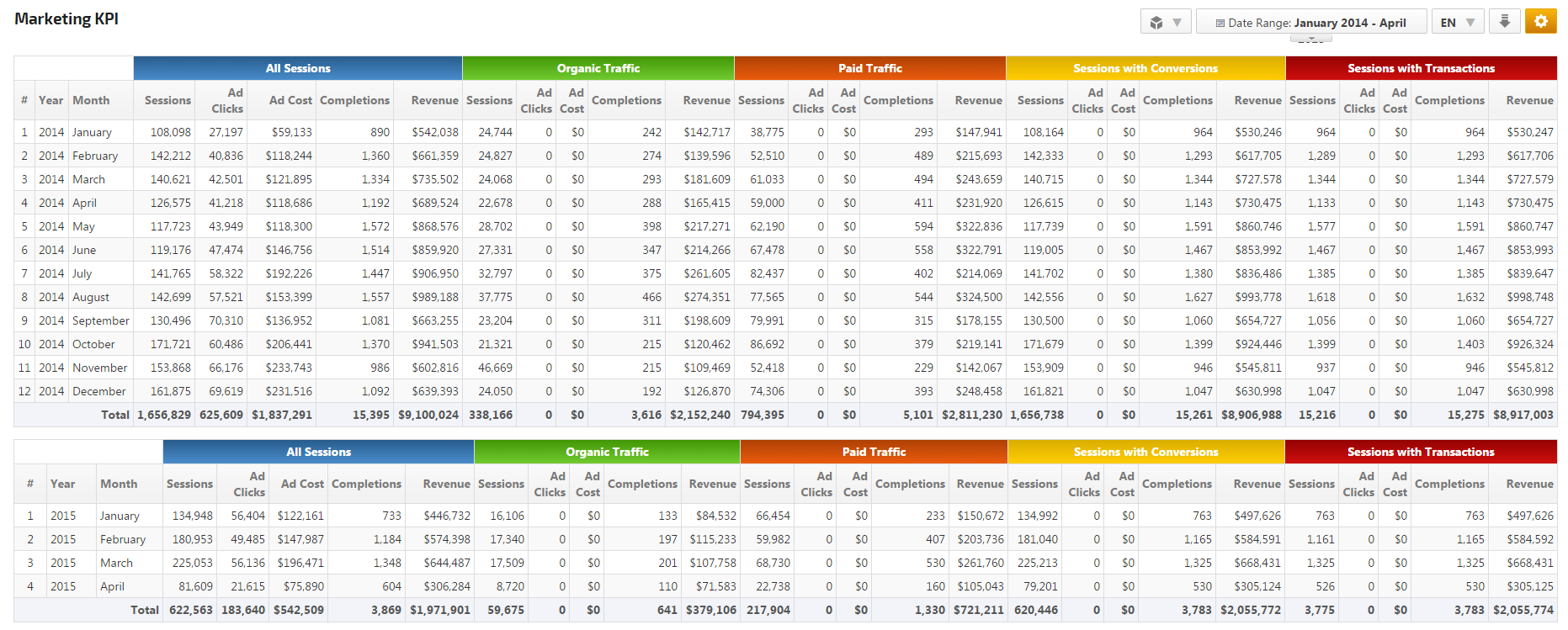 Measure and analyze the performance of online marketing campaigns and monitor trends with our Marketing KPI report. Select up to 5 segments at a time to create customized reports to determine Advertising ROI, the value of Mobile traffic, Referral and Direct vs. Search traffic or Organic traffic vs. Paid traffic, Goal Conversions, Revenue, user type and behavior, etc.