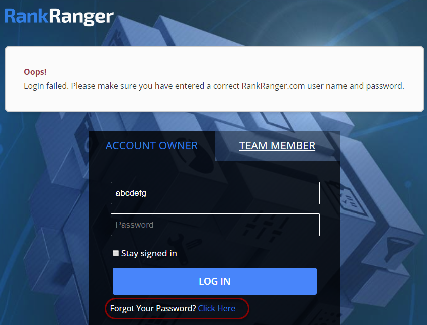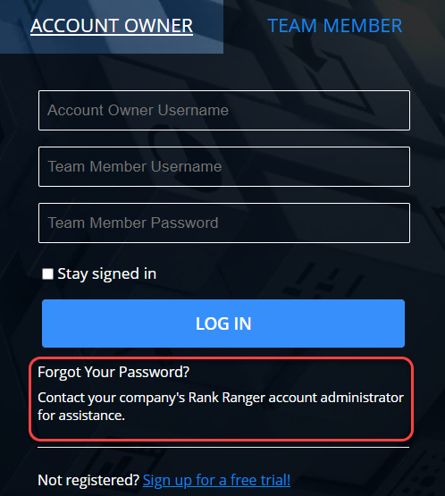 Your company's Rank Ranger account administrator controls login credentials for all team members via the Manage Users screens. Please contact your account administrator for assistance with resetting your password.