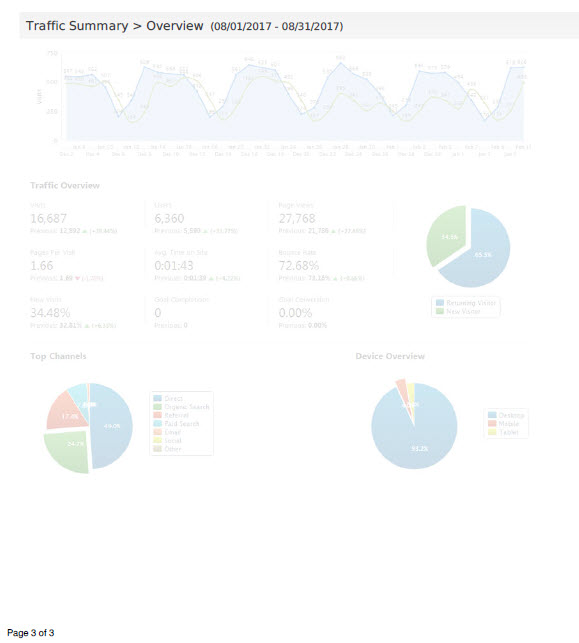In the case of third party data reports and graphs (e.g., website analytics, webmaster tools, social analytics, and a variety of other integrations), if the PDF report displays a title with no data below it or a faded report or graph image, that means the integration is not valid. It may not have been authorized, or authorization may have been revoked (by the account owner), or expired. Confirm correct connection in the corresponding Campaign Connect screens. You may need to renew or create a new authorized connection (
