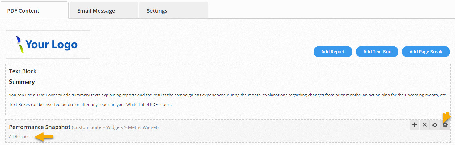 White Label PDF reports are generated based on two variables, automated scheduling settings and individual report content settings. If a PDF report is received with data missing, please check the following settings: