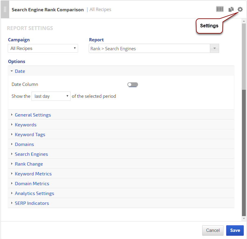 Click the gear icon to access the report's settings, expand each section that you want to change, and click the Save button.