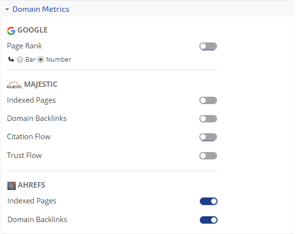 • Majestic: Domain Backlinks is the domain's total number of backlinks reported by Majestic