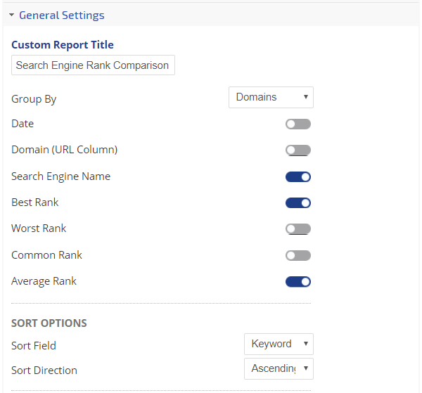 To emulate the Competitive View that you see for this report in the user interface, select Group By Keywords, and show the Domain URL column in the General Settings section.