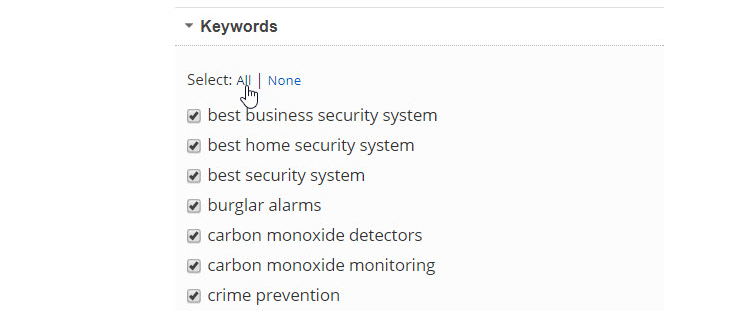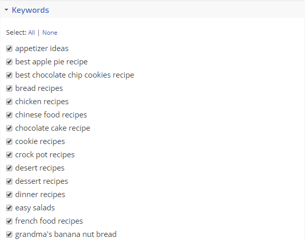 Select the keyword(s) you want displayed in the report: use the All or None link, or check the box beside each keyword
