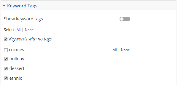 • Keyword Tags (to display only specific tags, use the tag filter in the Filters section of report options)