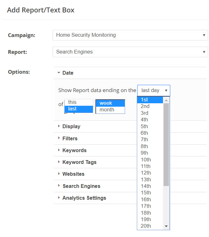 The Search Engines report can be customized using a wide variety of report options and added to a white label Marketing Dashboard, Client Dashboard or scheduled PDF report.