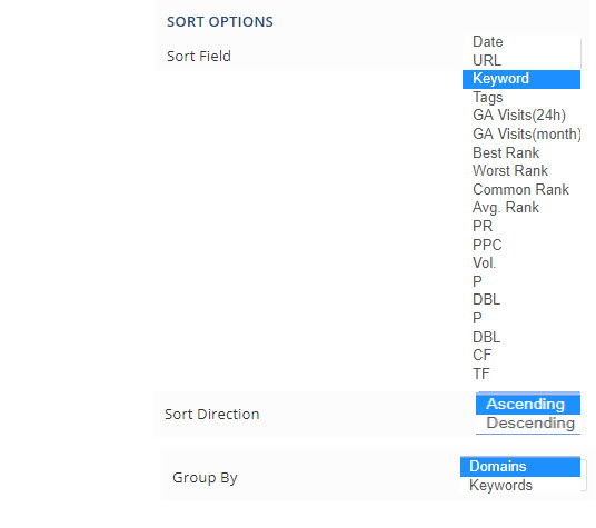 • Group By option: allows you to group by Domain (for viewing 1 table per keyword including competitor domains) and Keywords (for viewing 1 table with all keywords for 1 domain).