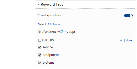 • Select the Tag(s) to filter the report results by: use the All or None link for quick selection or individually check the boxes beside the keyword tags to be included in the report.