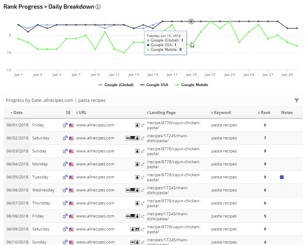 The Rank Progress Daily Breakdown report presents daily progress for each keyword including landing pages, search traffic metrics, and SERP features.