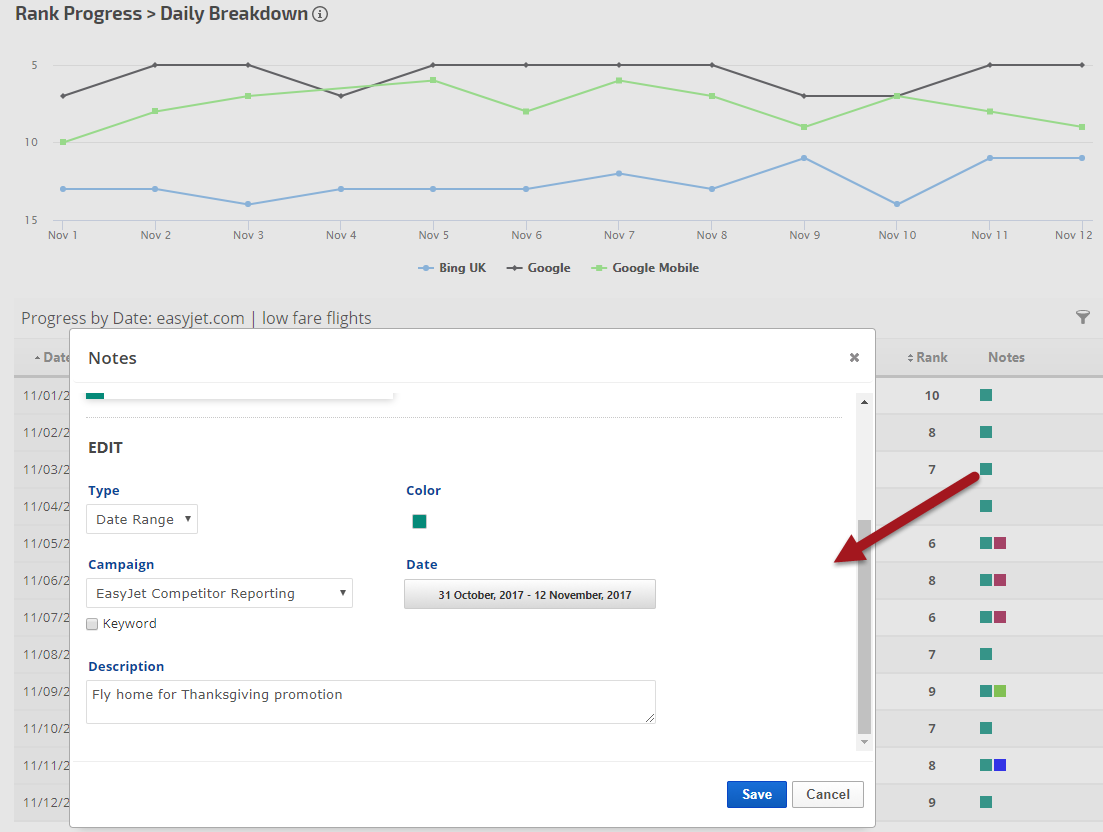 • Rank Graph: displays a trend graph of rank per search engine for the selected keyword.