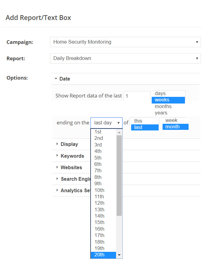 To change the number of weeks or months displayed in a specific report, click the gear icon for any marketing dashboard report element and expand the Date option section, enter the number and click the Save Button.