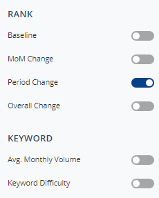 • MoM Change, then the rank change (increase/decrease) for a keyword for the last two months of the selected date range will be displayed in the table.