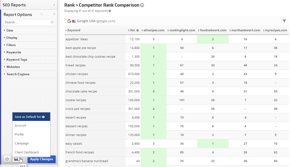 Rank Ranger reports allow for complete customization with regard to keywords, domains, search engines, and various rank, keyword, domain, and/or landing page metrics. Once you have customized your report exactly as you would like it to remain, you can easily save the settings as a report default. Available options include:
