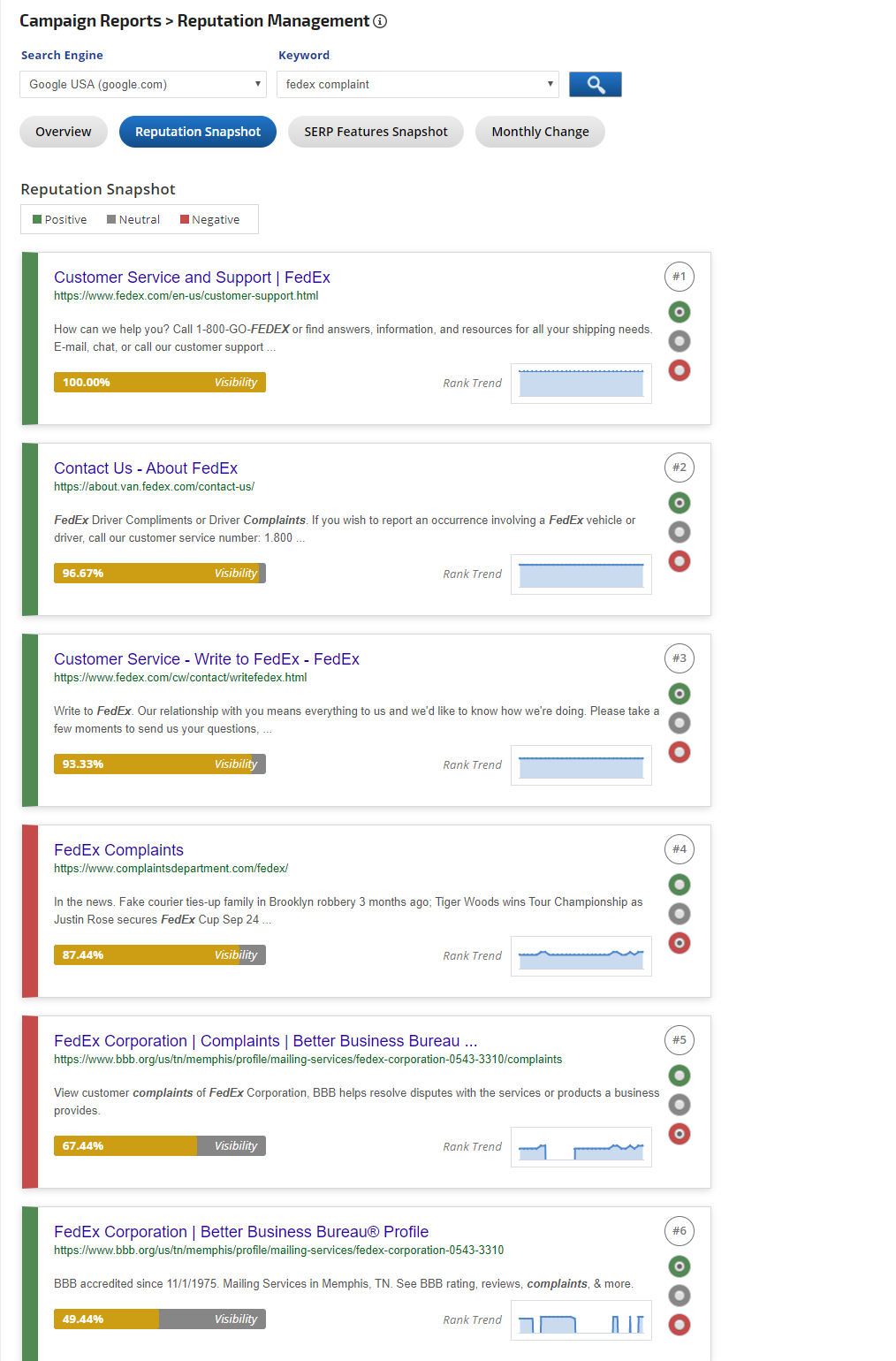 If online reputation management is important to you, then consider a subscription to a custom Reputation Management plan. These plans include access to this report suite that helps you analyze positive and negative brand related search results, and then monitor the progress of reputation management activities to improve brand sentiment.