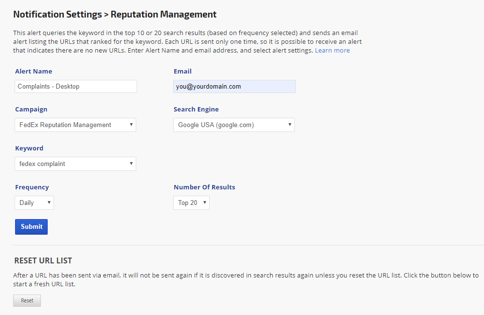 This email notification queries the keyword in the top 10 or 20 search results (based on the frequency selected) and sends an email alert listing the URLs that ranked for the keyword. Each URL is sent only one time, so it is possible to receive an alert that indicates there are no new URLs.