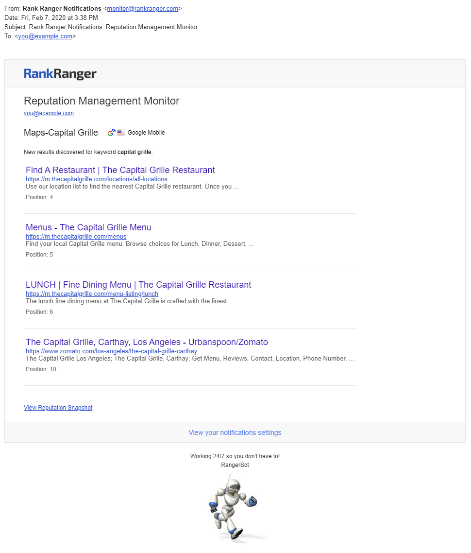 A report like this including the campaign name, search engine, and keyword with SERP Title, URL, description, and rank position of pages related to the reputation of the brand or domain being tracked can be sent to your email address.