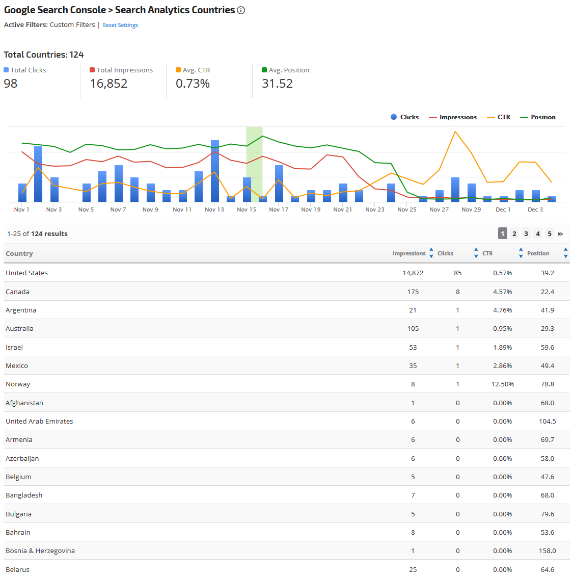 The Search Analytics Countries report provides a combination graph and table detailing the number of Impressions, Clicks, CTR, and Average Position per country. A custom filter makes it possible to filter the report by Search Type(tabs in Google Search), Country, Device, Page, or Query for a specific value.