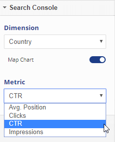 The Google Search Console Chart / List widget provides a colorful graphic presentation of search metrics from the website's Google Search Console account. A variety of display options include color palette, pie chart, column chart, map, and table list. Dimension options include country, device, page, and query. Metric options include average position, clicks, CTR or impressions. A compare to past option allows for additional analysis of either data value or percentage.