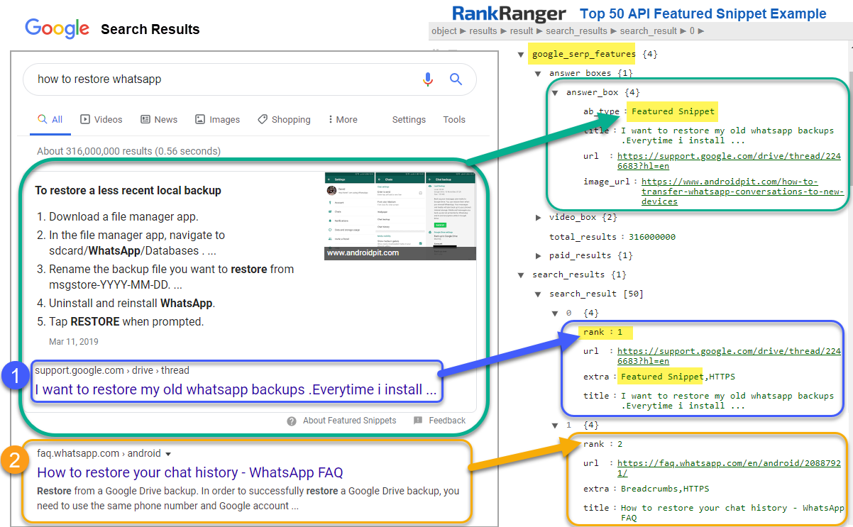 • In the search_results for each rank position, our Rank Top 50, Rank Top 100 and Search Query APIs provide rank, url, extra and title.  SERP indicators are recorded as extra data, extra: Featured Snippet is the indicator you will see when a keyword ranks in position 1 inside of a Featured Snippet.
