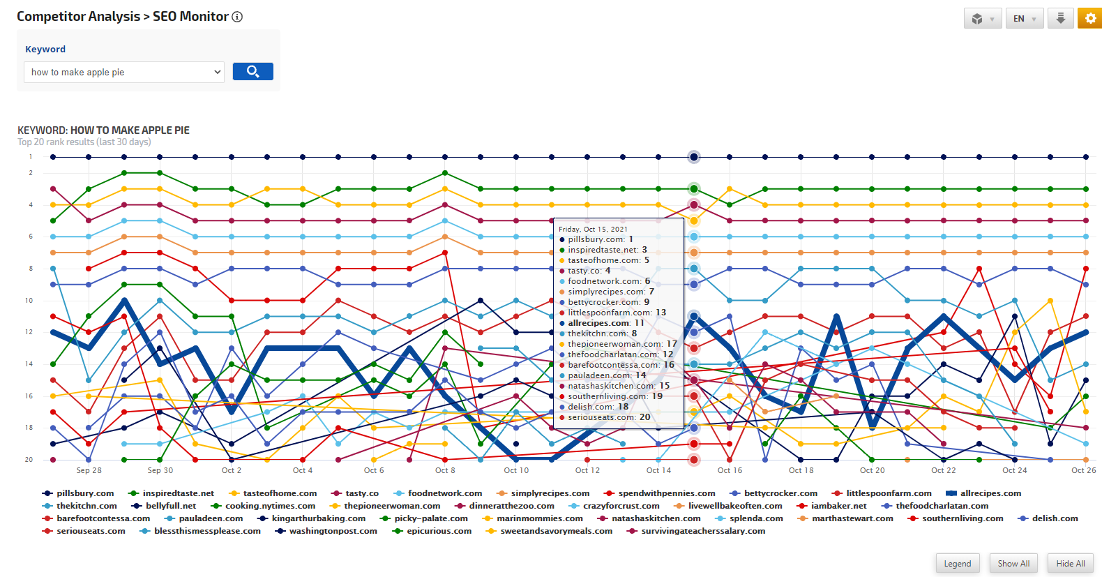 Below the graph, the Legend button is enabled by default the display of a legend detailing the URLs and the graph color that represents each. You can toggle the display of rank trend for a specific domain on or off by clicking the domain URL. The Show/Hide All buttons enable the user to unselect or select all listed domains.