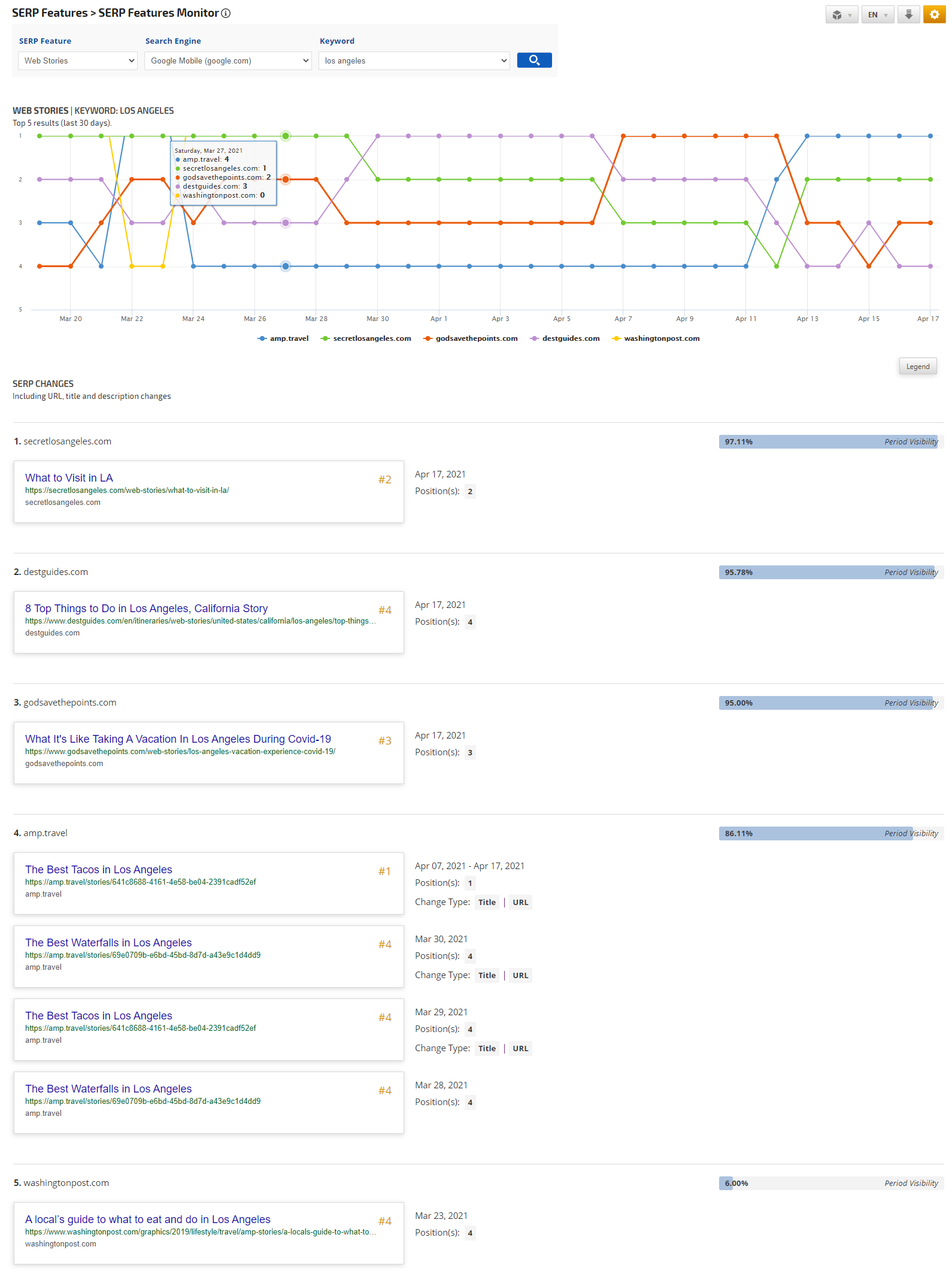 The SERP Features Monitor provides title, URL, and domain when Web Stories display in the search results. In the example below, the keyword "los angeles" was tracked on a mobile search engine and we see that the data for the 5 competitive domains during the last 30 days.