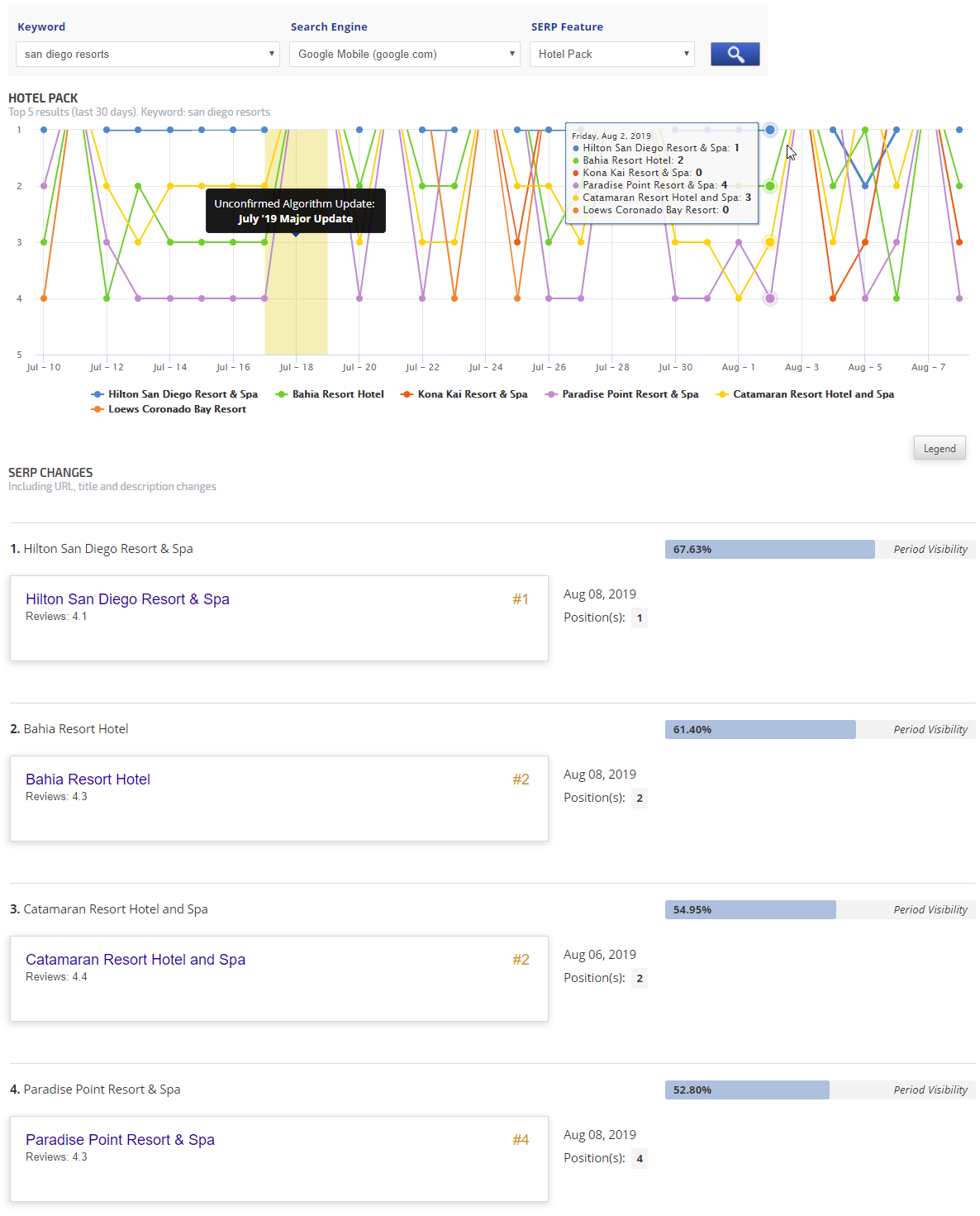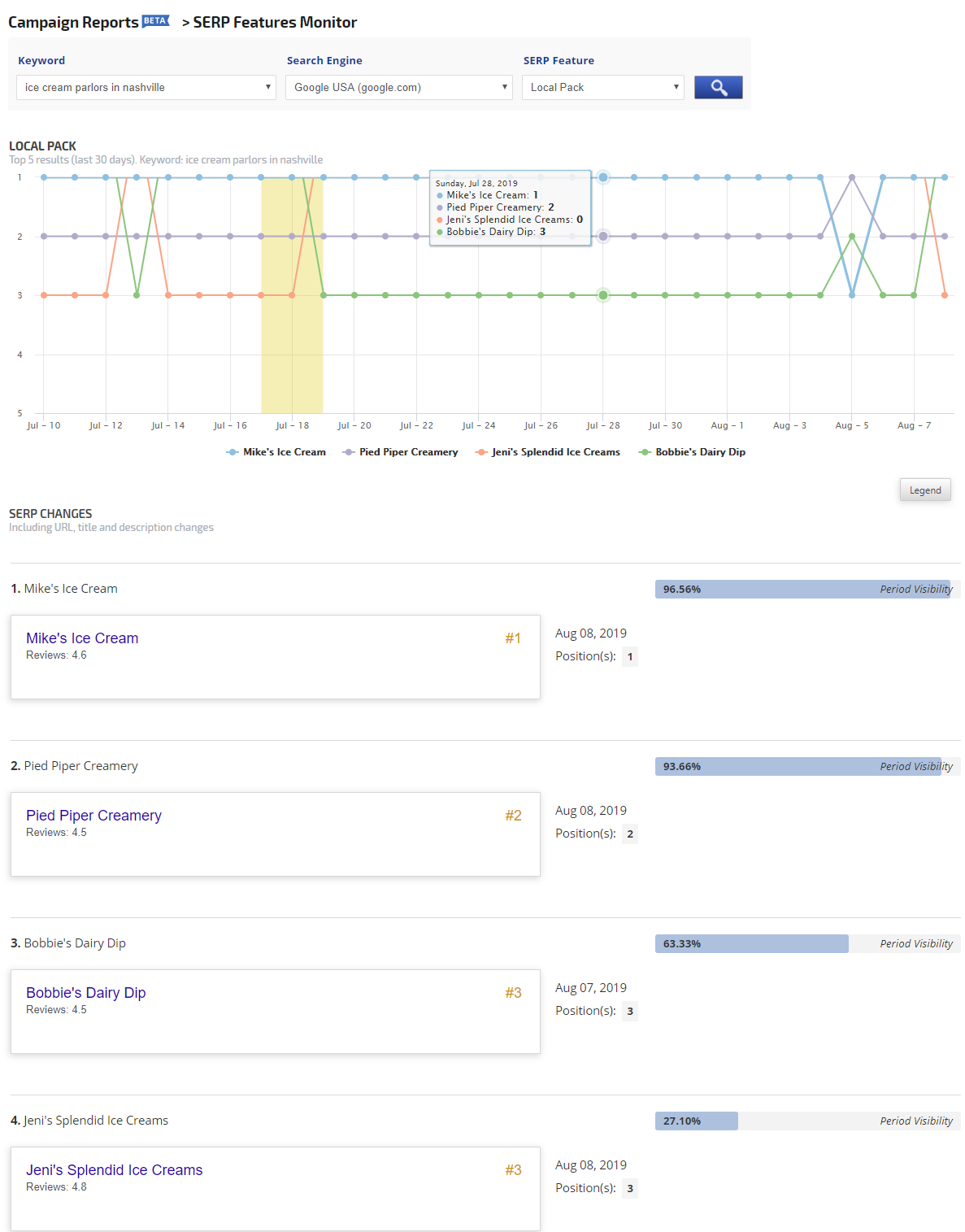 SERP Features Monitor can help you determine which sites are consistently in the Local Pack and how often Google is switching between the domains it ranks for those coveted spots.