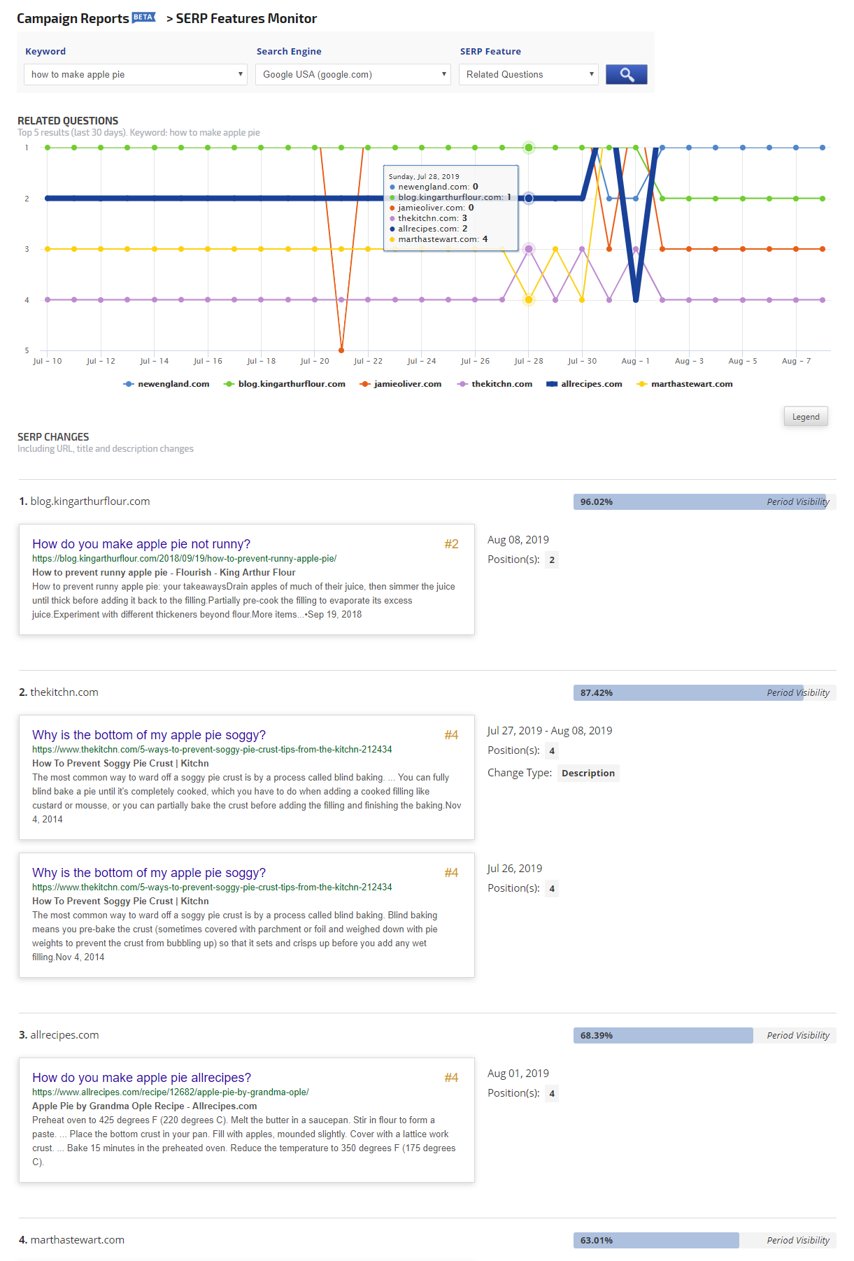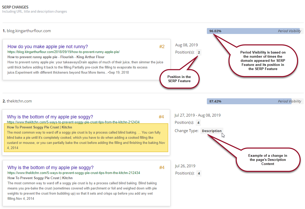 - Percentage of Period Visibility, which is based on the number of times the domain appeared for the SERP feature and its position
