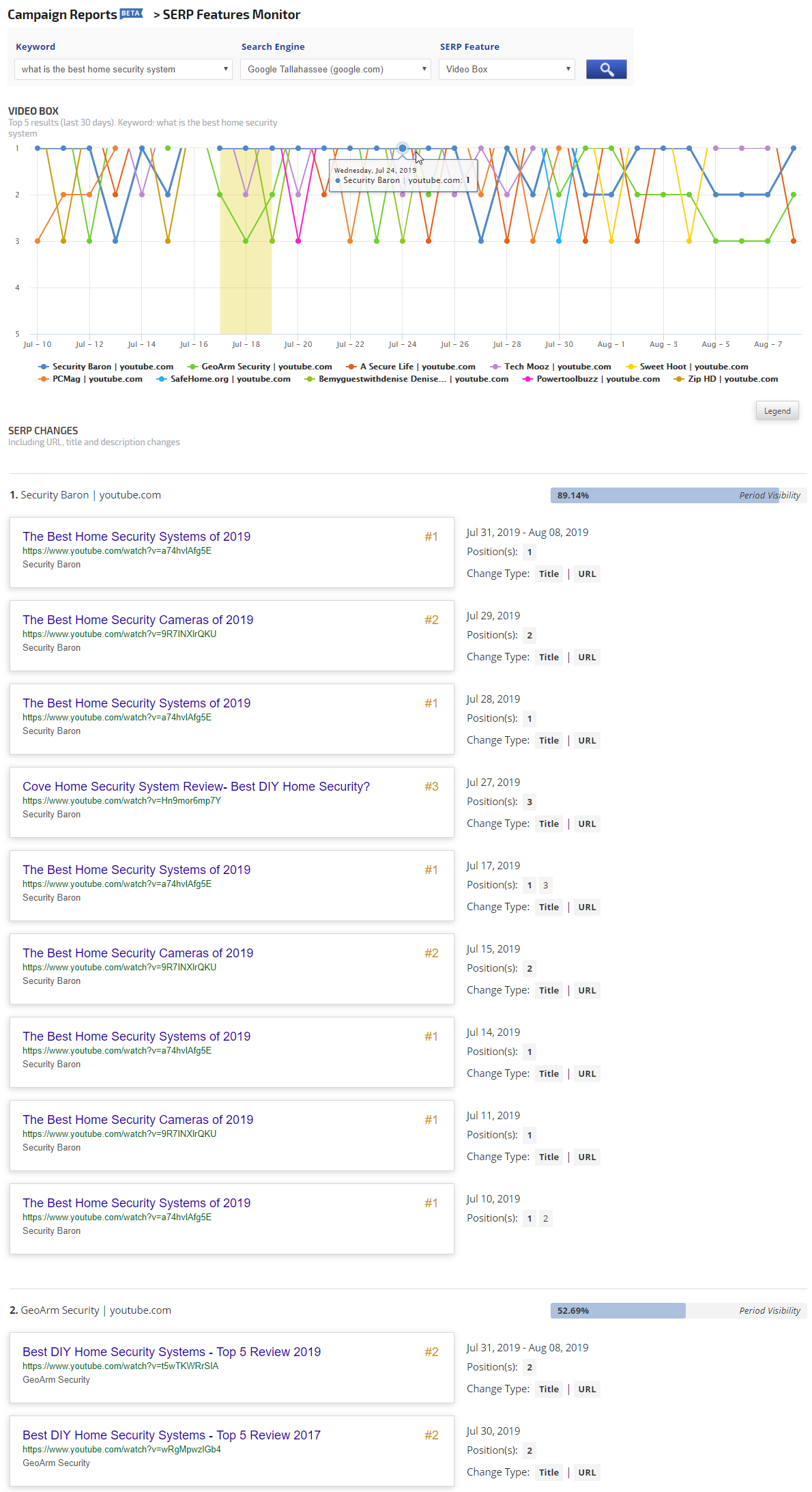 SERP Features Monitor provides title, URL, and YouTube channel name when YouTube videos are displayed in the search results. In the example below, the phrase "what is the best home security system" was tracked on a custom location-based search engine and we see that 10 YouTube channels competed for a spot in the video box during the last 30 days.