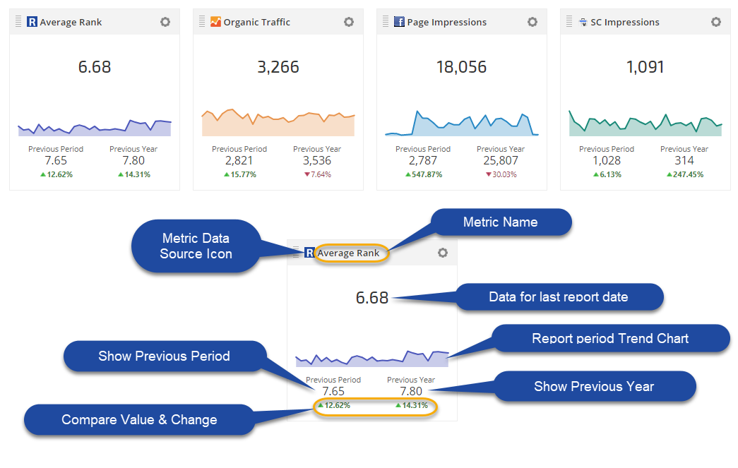 Yext: Average Rating, Facebook Check-ins, Facebook CTA Clicks, Facebook Page Impressions, Facebook Page Post Impressions, Facebook Page Views, Facebook Talking About This, Facebook Likes, Facebook Were Here, Featured Message Clicks, Foursquare Daily Checkins, Google Customer Actions, Google Customer Actions Phone Calls, Google Customer Actions Get Directions, Google Customer Actions Website Clicks, Google Map Views, Google Search Views, Google Search Queries, Google Search Queries Direct, Google Search Queries Discovery, Instagram Posts, New Listings Live, New Reviews, PowerListings Live, Profile Updates, Profile Views, Publisher Suggestions, Searches, Social Posts, Yelp Customer Actions, Yelp Page Views