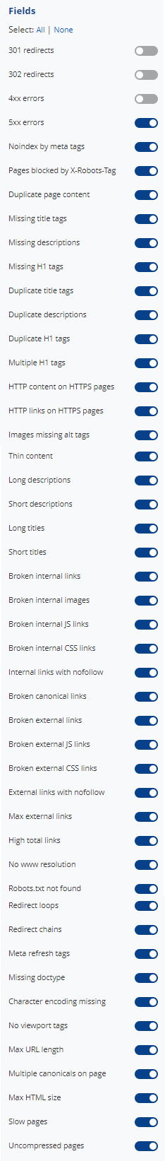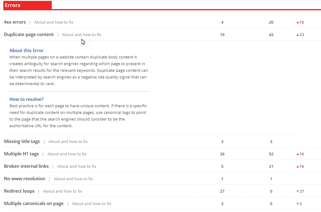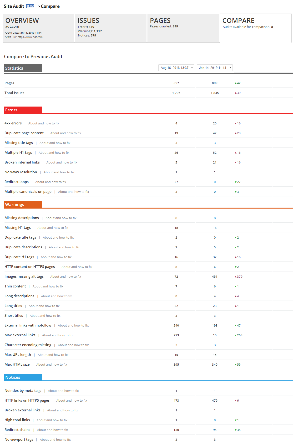 The Site Audit Compare report makes it possible to compare the results of 2 audits side-by-side, along with an indicator of positive and negative change. Included are: