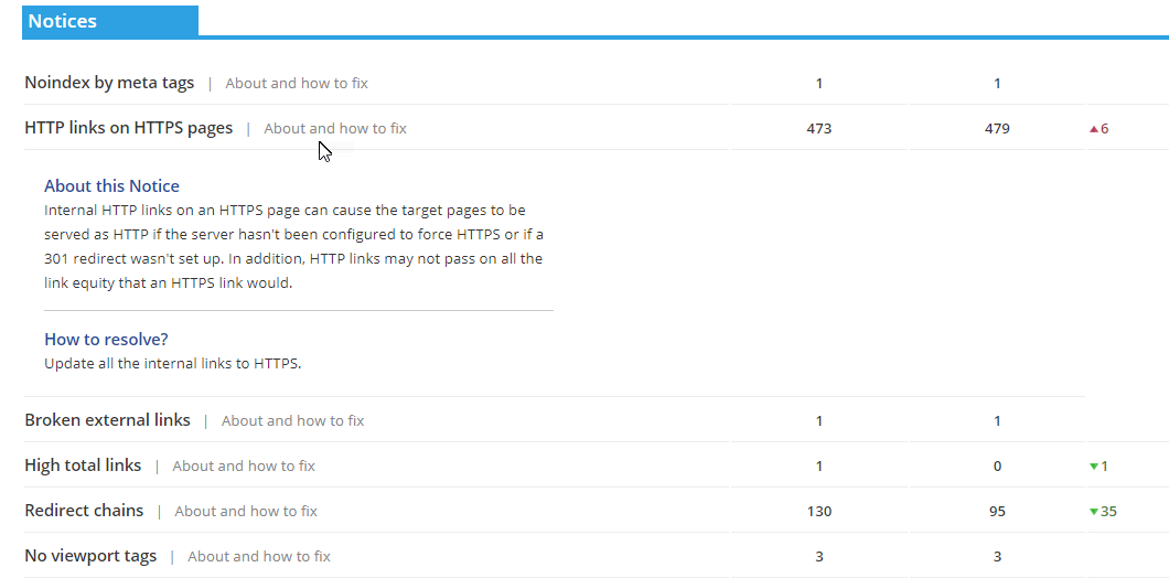 Although less serious than Errors, remedying the items listed in the Notices section can improve SEO or user experience.