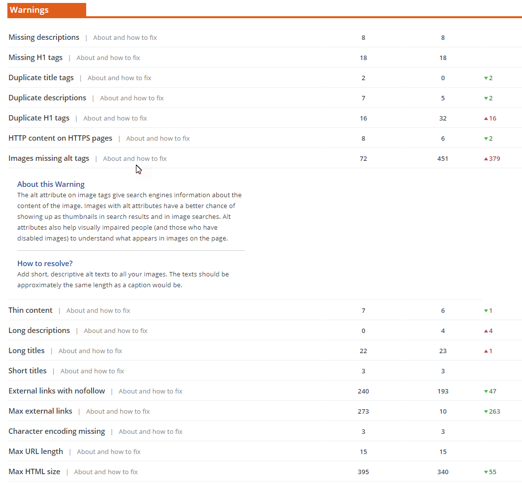 Issued listed in the Warnings section have the potential to damage search engine ranking, as well as reduce the possibility of a searcher clicking through to the site.