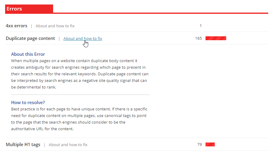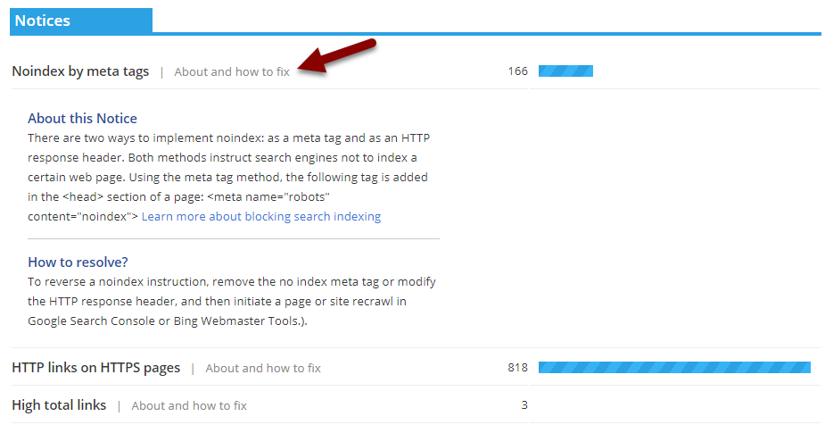 The Site Audit Issues report provides a list of the issues discovered during the website audit, along with an explanation of each issue and information regarding how to resolve the issues to improve SEO and search user interaction. There are three categories of messages in this report and they are listed in order of importance: