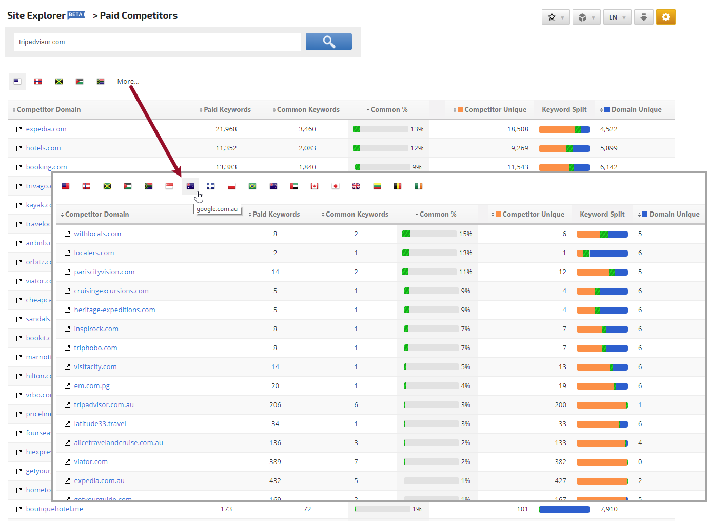 - A Keyword Split graph indicating keywords unique to competitor, common %, and domain unique
