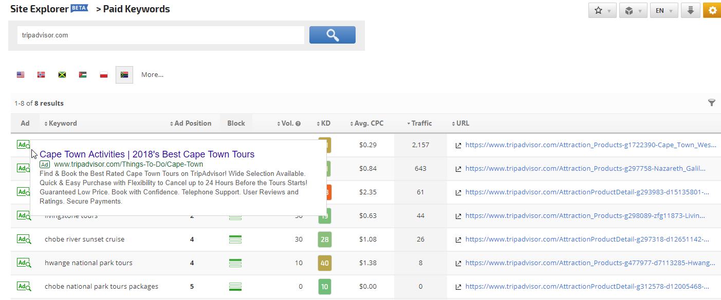 When a site has ads displaying in more than one country search engine, a ribbon of country flags displays directly below the search bar. Clicking a country flag launches the Paid Keywords report for the site's ad appearances in that country's Google search results.