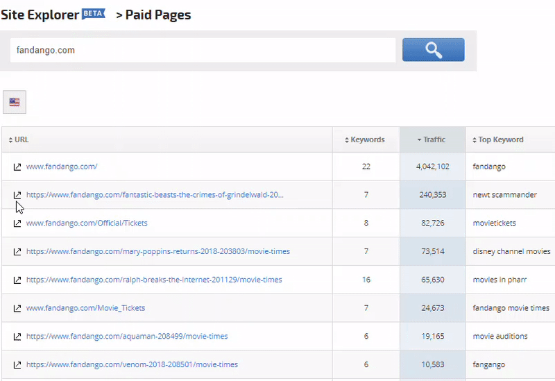 - Click the URL to launch the Paid Keywords report filtered for the ad's landing page to view additional keywords and ads for the page