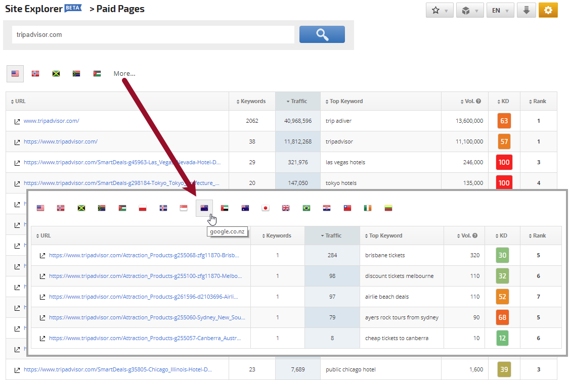 Enter a domain URL, click the search button, and the Paid Pages report provides a list of pages that were linked to Google Ads in search results.