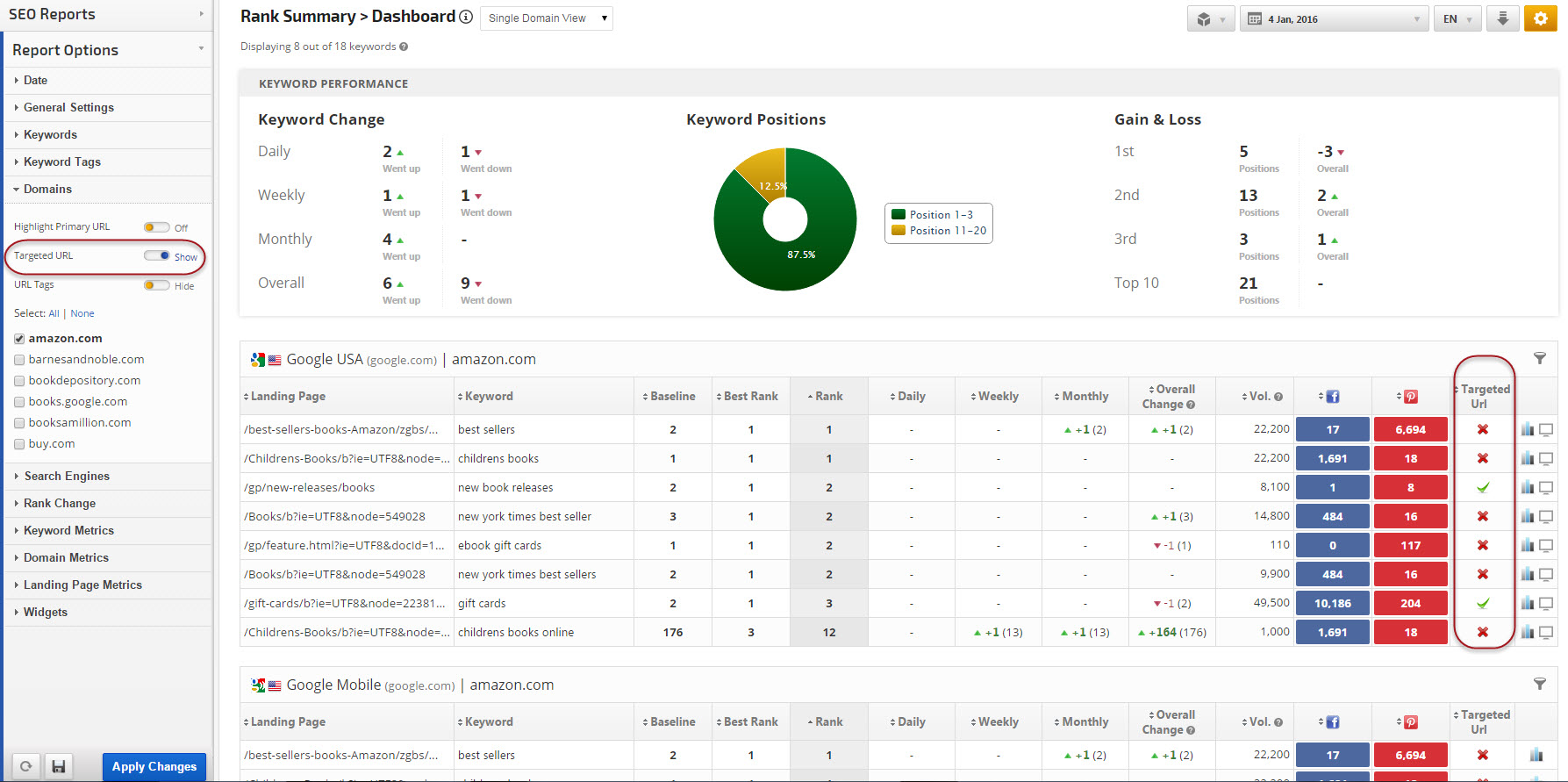 Indication of whether or not the keyword ranked for the Target URLs, can be set to Show via Report Options in the Rank Tracker Dashboard report. When the target URL matches the ranked landing page exactly, a green checkmark displays in that column, if a different landing page ranks, then a red X displays (as shown in the example below).