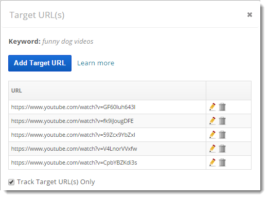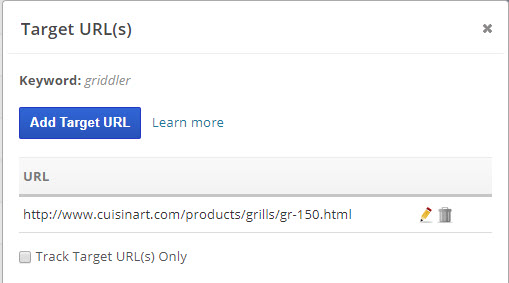 In this example we've added the following Target URLs to a keyword and checked the Track Target URL(s) Only box: