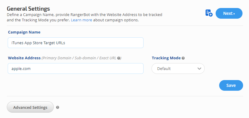 Target URLs are intended for rank tracking of service or location-based businesses that have multiple locations (e.g., real estate, hotels, restaurant chains, etc.), as well as YouTube videos and Apps in Apple iTunes or Google Play Store.