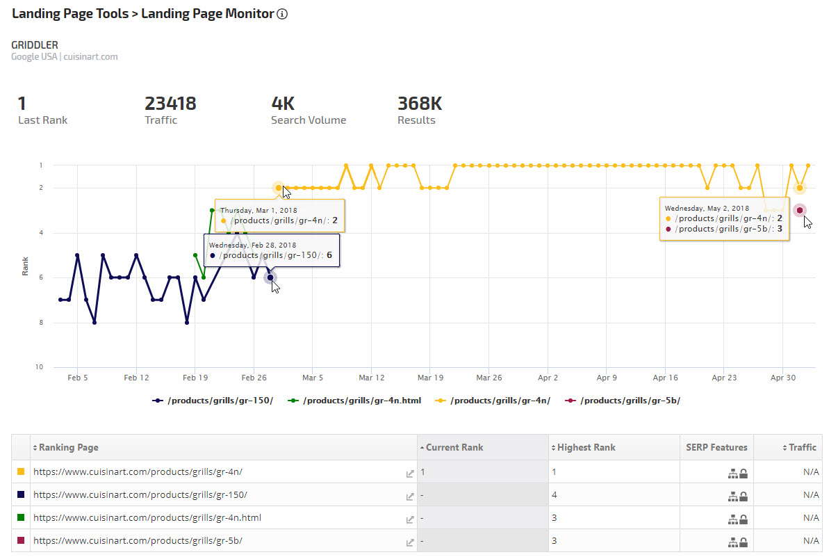 When you enter a Target URL and do not select the "Track Target URL(s) Only" option, a landing page feature is enabled in the Rank Dashboard report that can help you discover fluctuations in the domain's pages that Google has provided for the keyword.