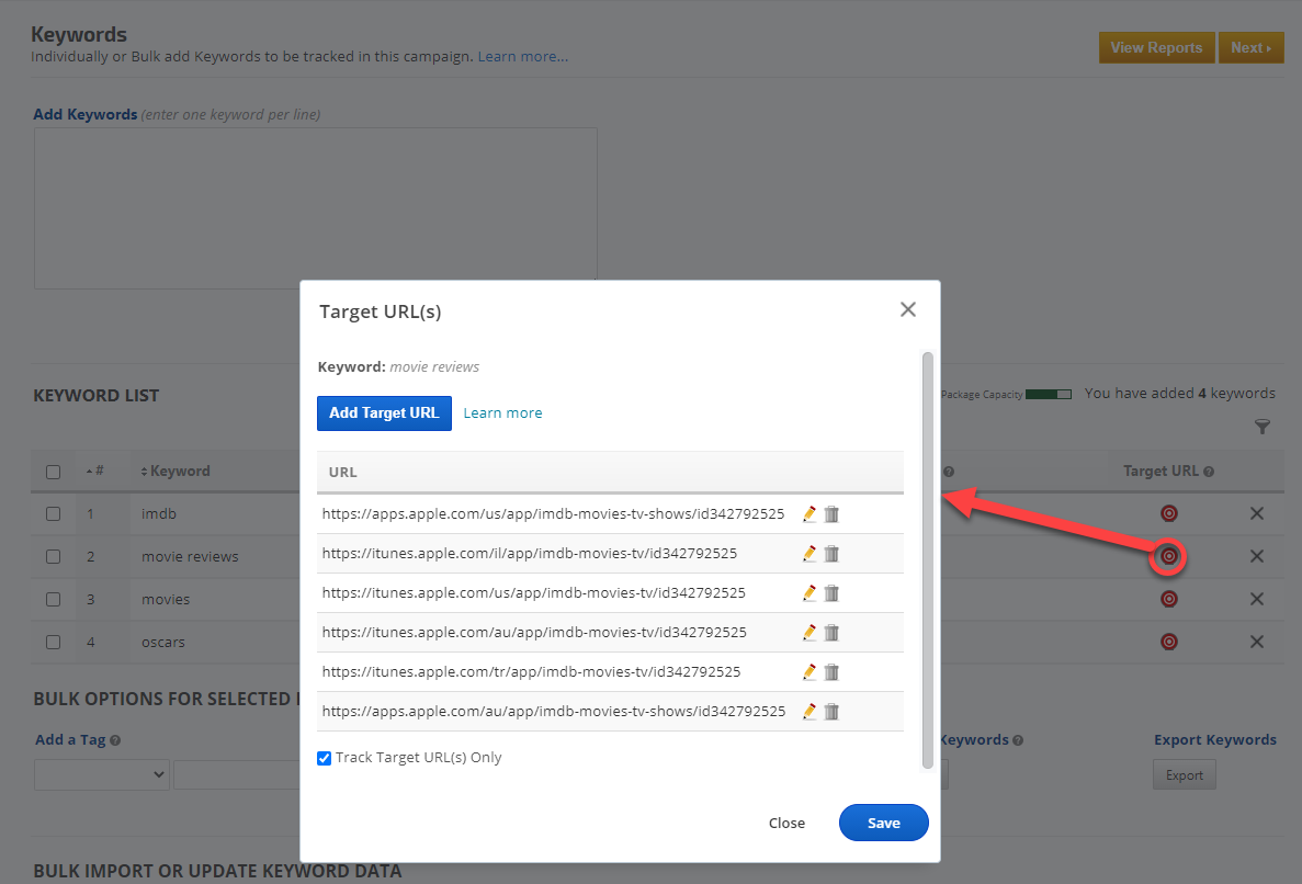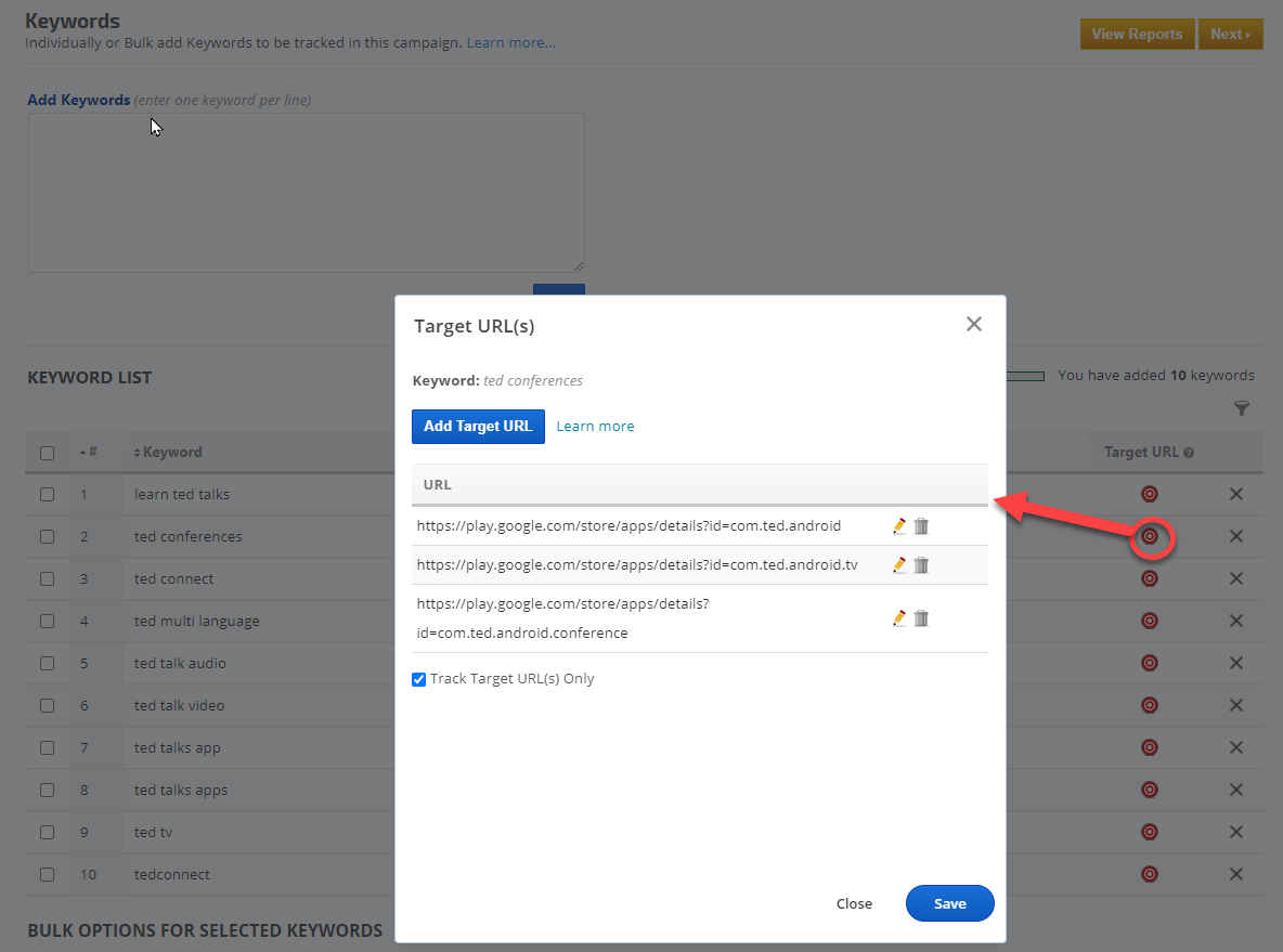 Manually add keywords and Target URLs or import them from the sample spreadsheet. In this example, we have added Target URLs for 3 related TED apps in the Google Play Store. When using the import file, this is an example of the correct format for the Target URL field (i.e., full URLs with a comma between each):