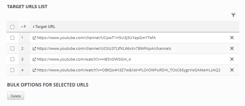 To delete one or more Target URLs select and click Delete or click on the X to delete each individually.