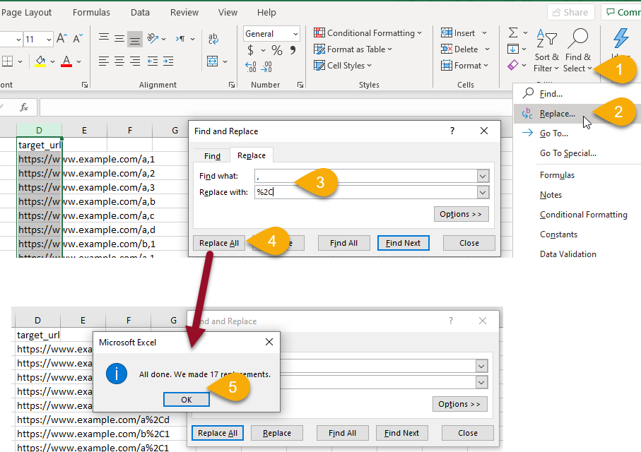 In order to import Target URLs that contain commas, you must convert the commas to %2C. This can be accomplished using Excel's Find & Replace feature.