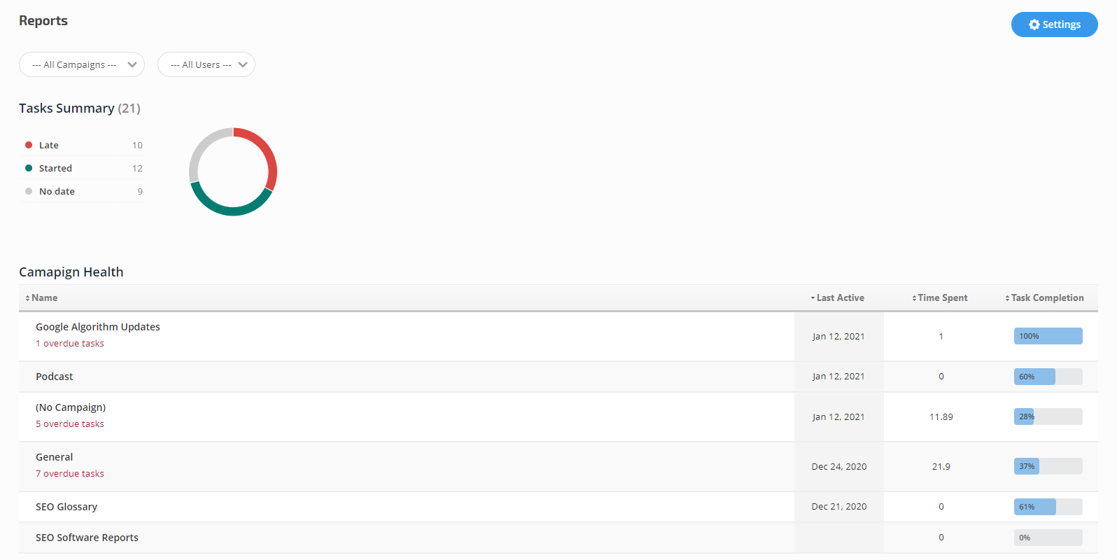 Campaign Health is a list of Campaigns the tasks assigned to. The tasks not assigned to any campaign will be combined under the name (No Campaign). The table displays the breakdown by Name, Last Active, Time Spend and Task Completion.