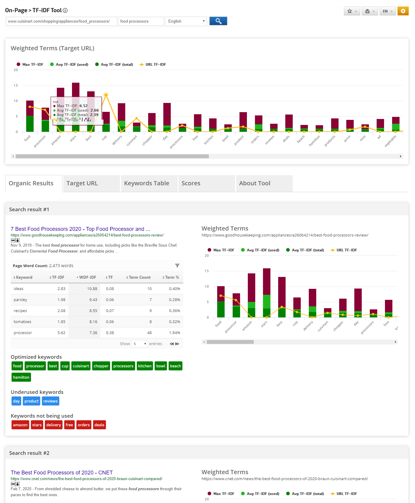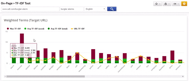 The top graph displays Max TF-IDF, Avg TF-IDF (used), Avg TR-IDF (total) and URL TF-IDF weighted terms for the URL. Depending upon the number of terms, you may need to scroll to the right to view all.