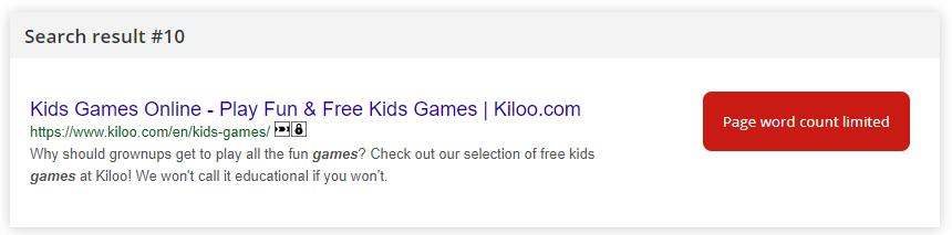 This message means that the content is too thin to be included in the analysis because it would skew the results. There can be various factors causing a "Page word count limited" message. In the case of the example below, our On-Page Keyword Optimization tool indicates that the page is missing a Doctype declaration, failed the Page Response Speed and Mobile Friendly tests, has more than 100 images without any Alt Tags, and Code to Text Ratio is poor.