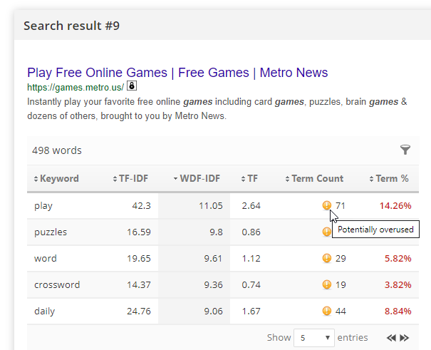 Viewing the above example, we can see which keywords are already optimized, those with term count that is too high, missing meta description, and which keywords are overused, underused or not used at all.