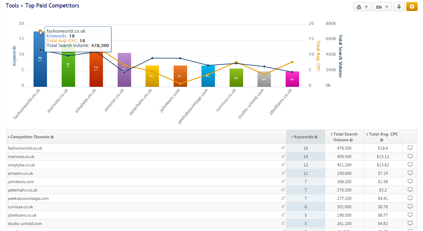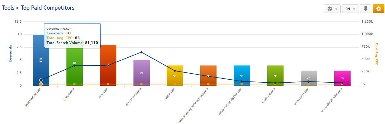 The Top Paid Competitors report provides insight into your top competitors ad ranking, exposing which keywords they are focusing their advertising budget on.